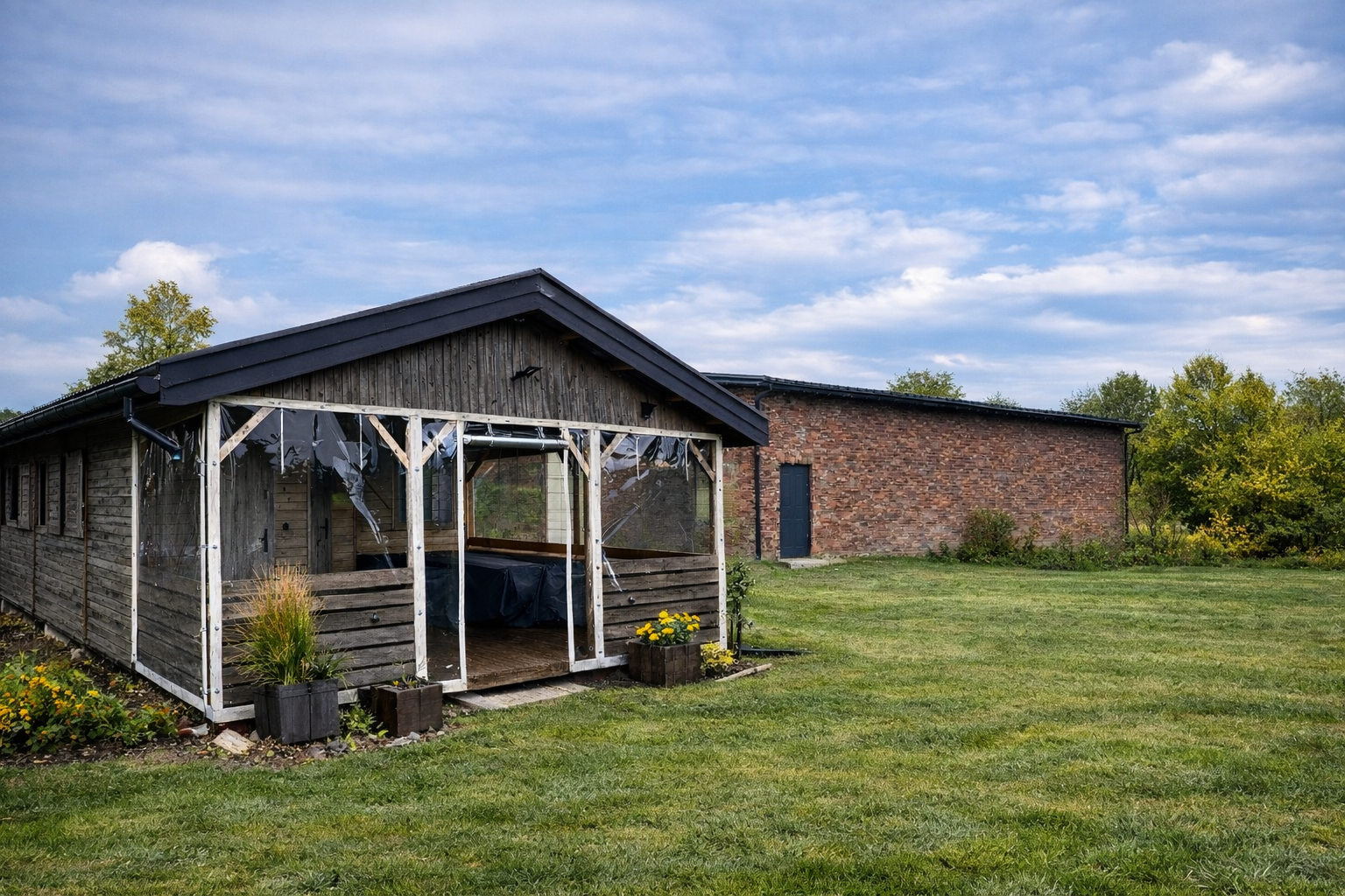 Przezroczysta plandeka lub kurtyna PCV tworzy szczelną barierę, która ogranicza działanie wiatru i zatrzymuje opady atmosferyczne.
